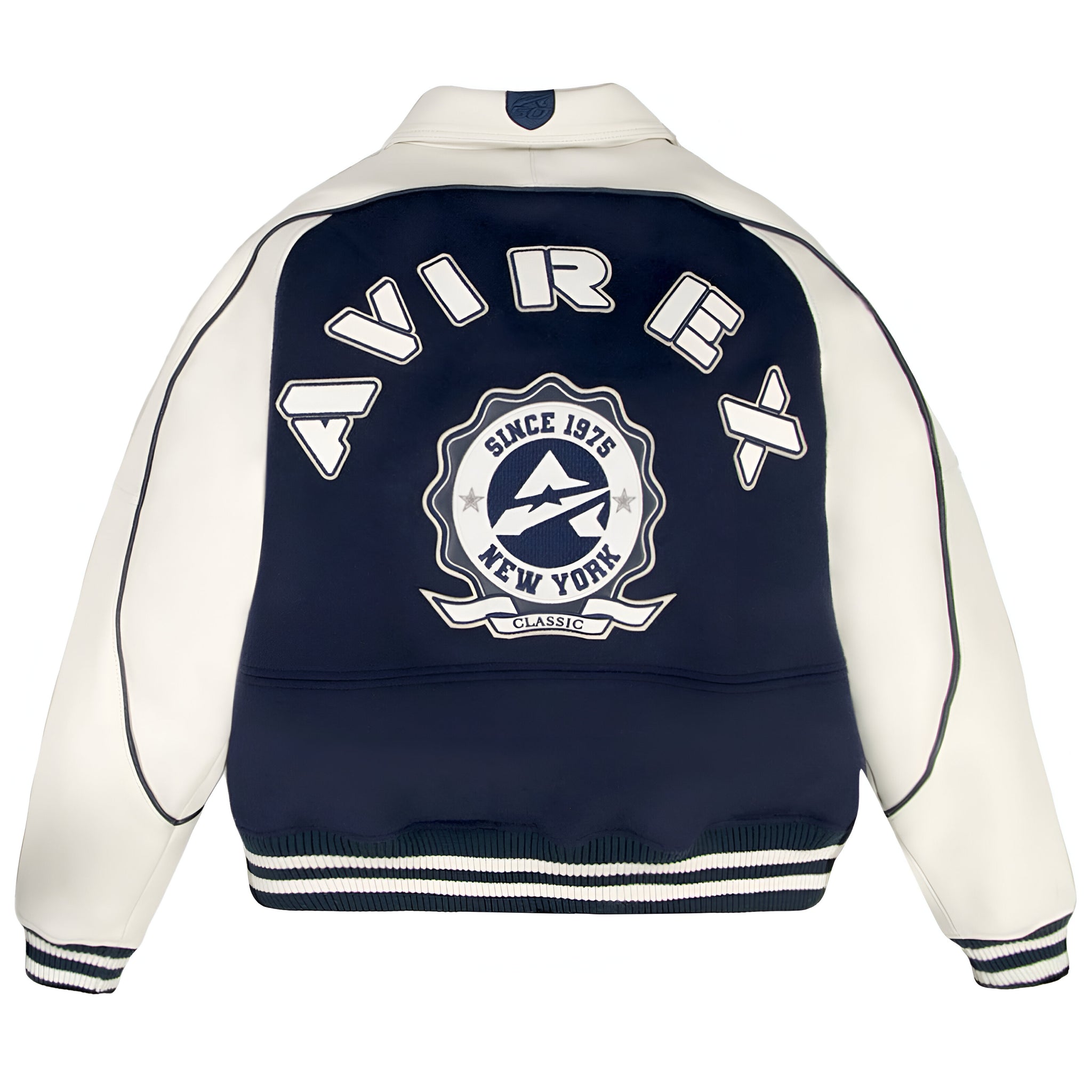 Avirex varsity jacket with embroidered logo at front chest and Avirex varsity appliques at back.