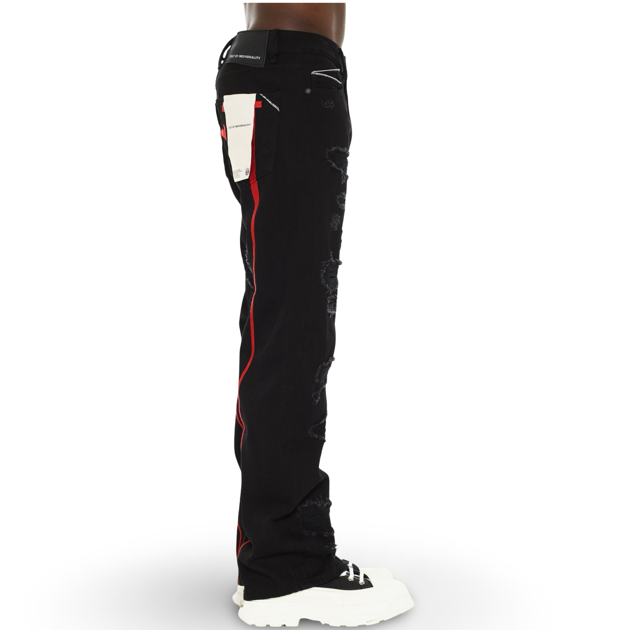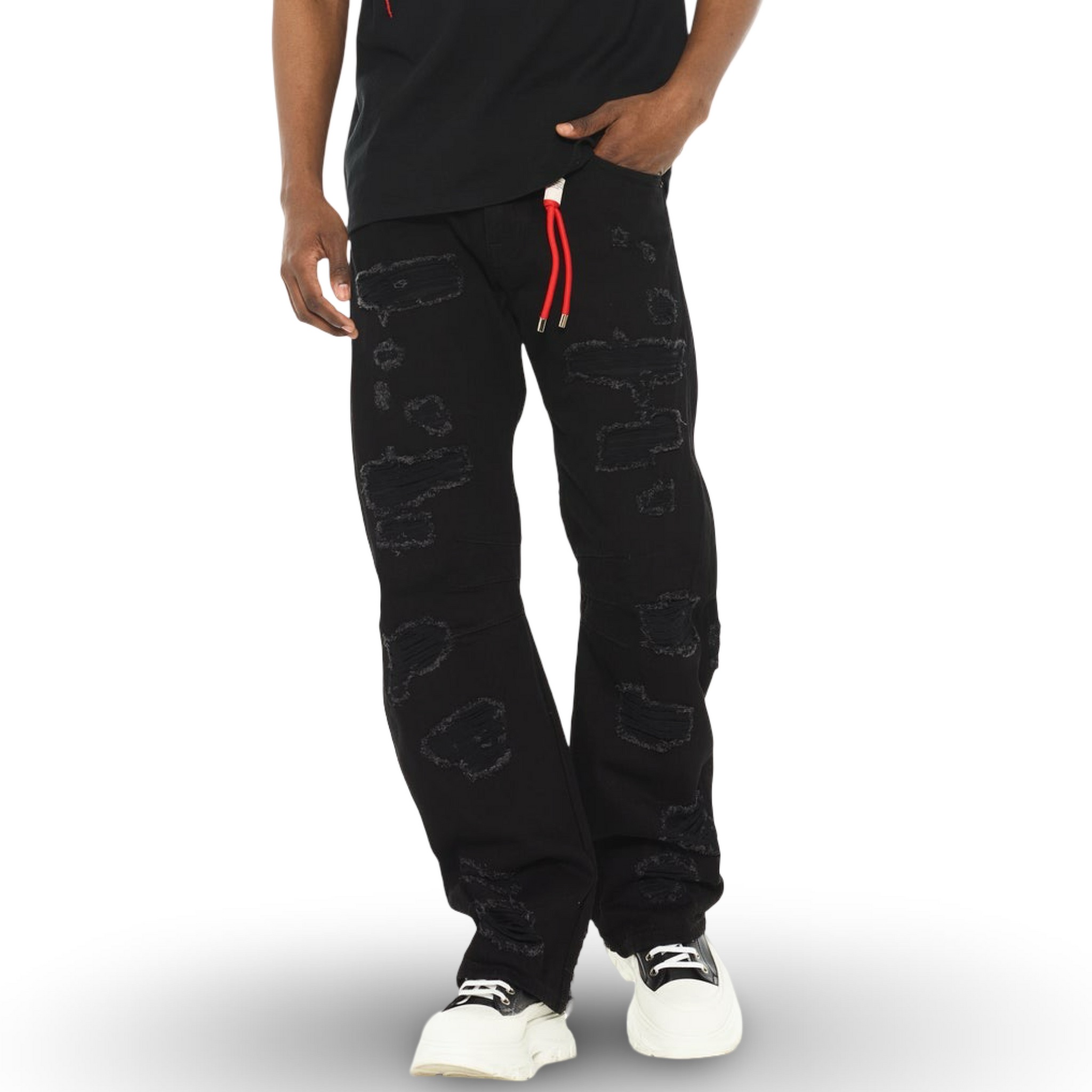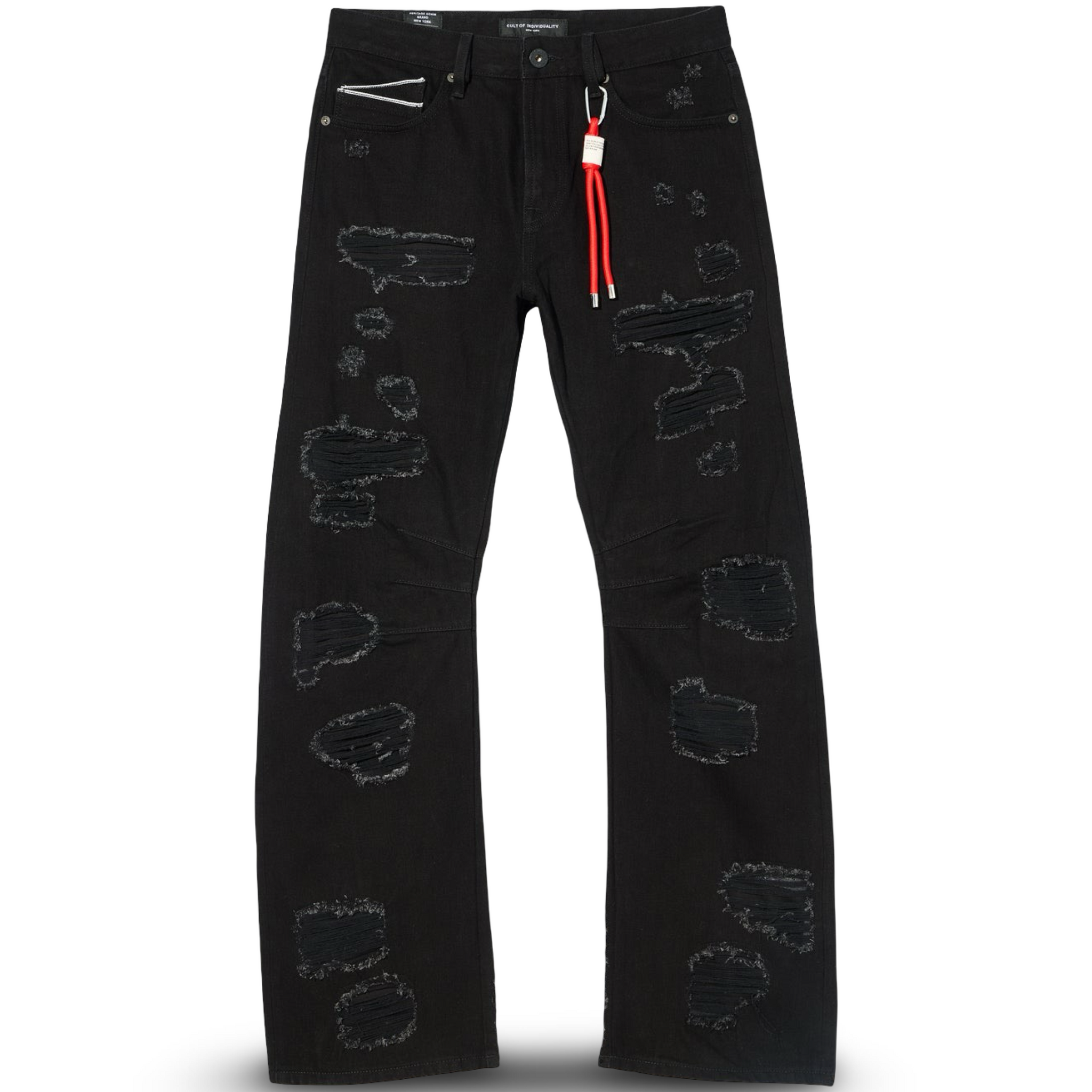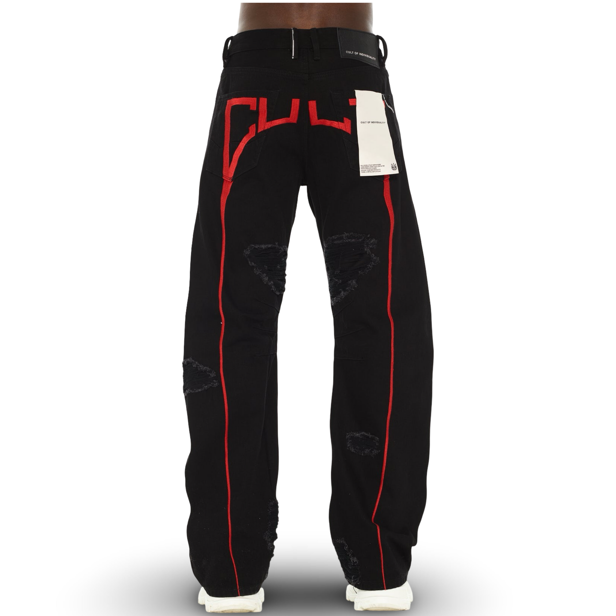 Our Grunge Baggy jean is our loosest fit yet, with a 20" leg opening. The relaxed baggy fit of these jeans provide both freedom of movement and a distinct edge to your wardrobe. Crafted from a premium black denim accented with heavy rip and repair detailing on the front and vibrant red 3D embroidery on the back. This jean is finished with our signature back pocket flasher, drawcord keychain, and Cult signature XX on back leg.