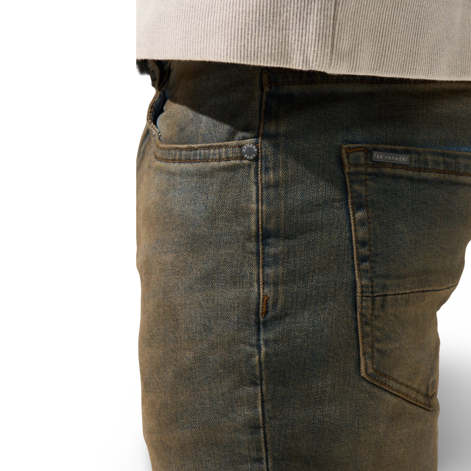 SERENEDER OUD Jeans - Dark denim base with brown overdye wash. Fading and whiskering throughout, distress on both knees. Signature fitted construction with earth brown character.