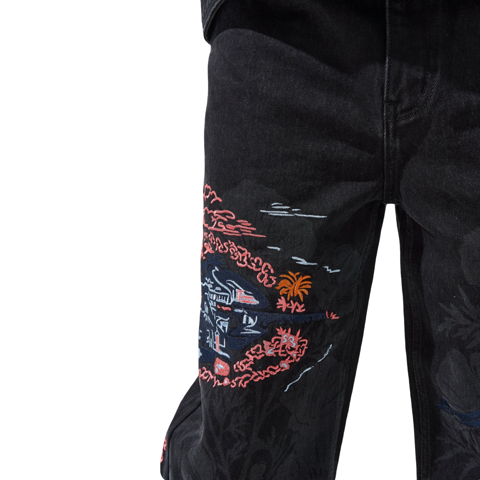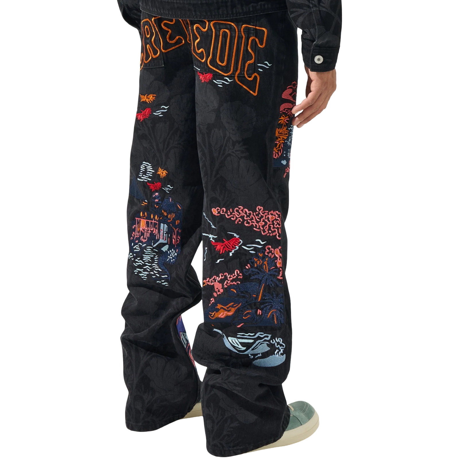 SERENEDE® SOUVENIR Baggy Jeans - Black wash baggy jeans featuring oversized construction. This statement piece showcases artisanal embroidery detailing with botanical print composition throughout for elevated streetwear styling and relaxed fit silhouette.