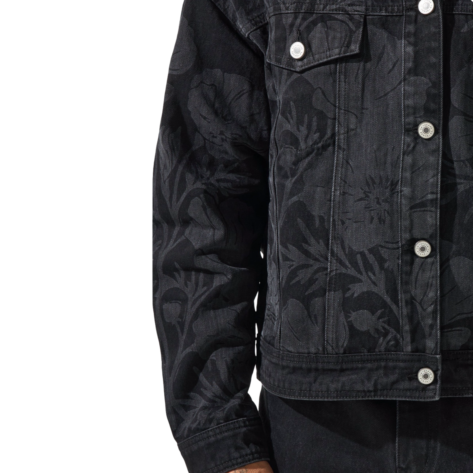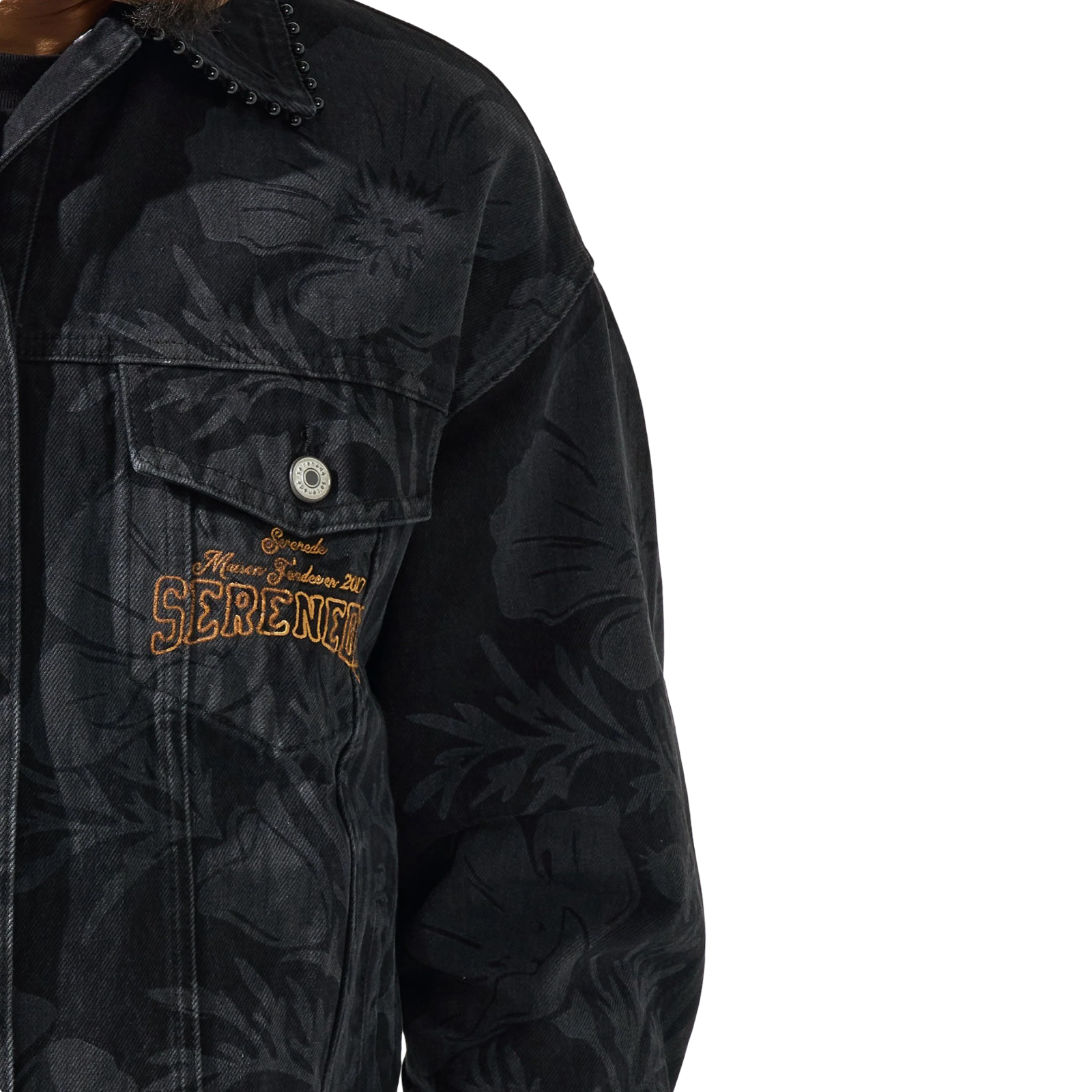 SERENEDER SOUVENIR Denim Jacket - Black denim jacket with floral print.