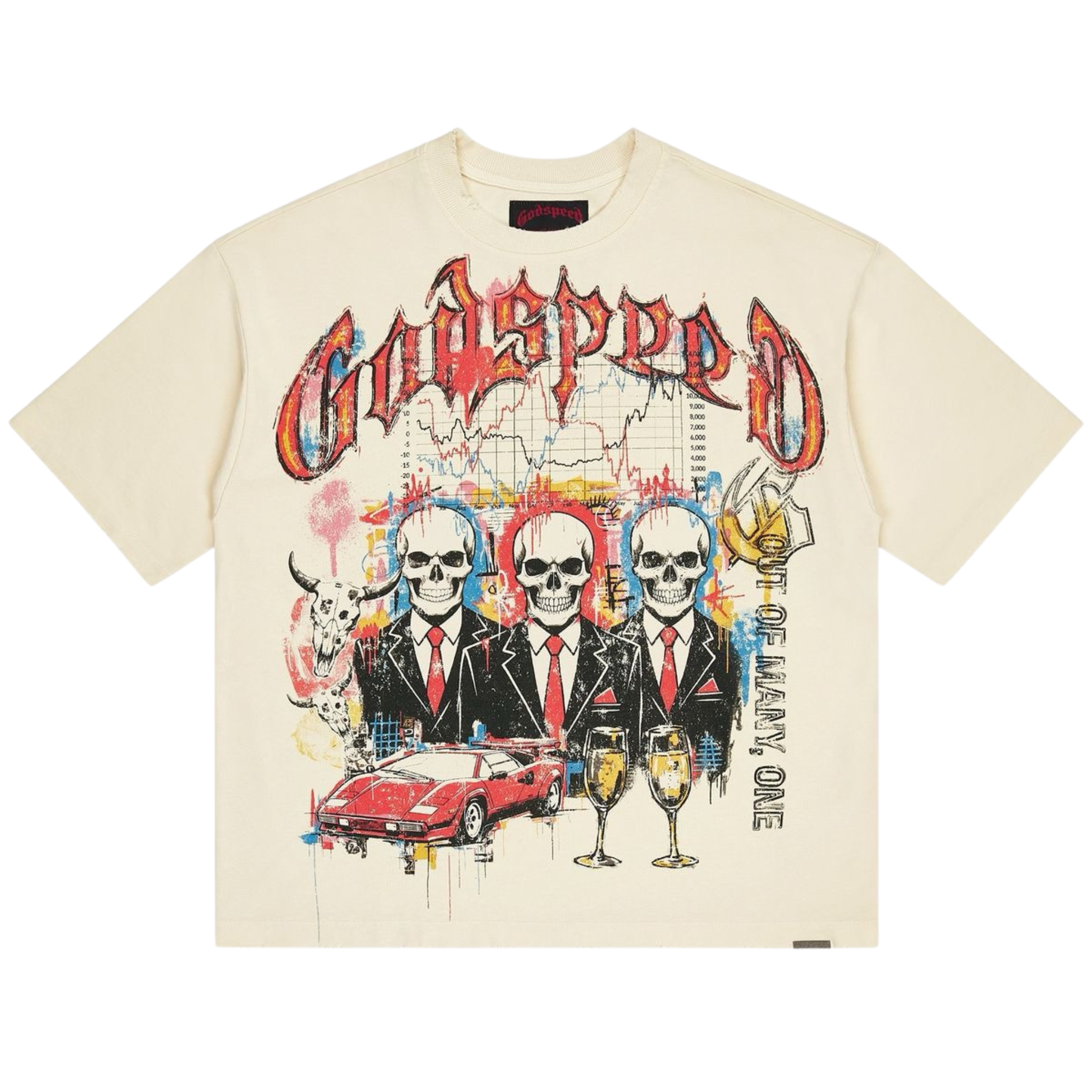 This T-Shirt is crafted from 10oz mid-weight washed fabric and features a striking art piece topped off with stones around the crown.