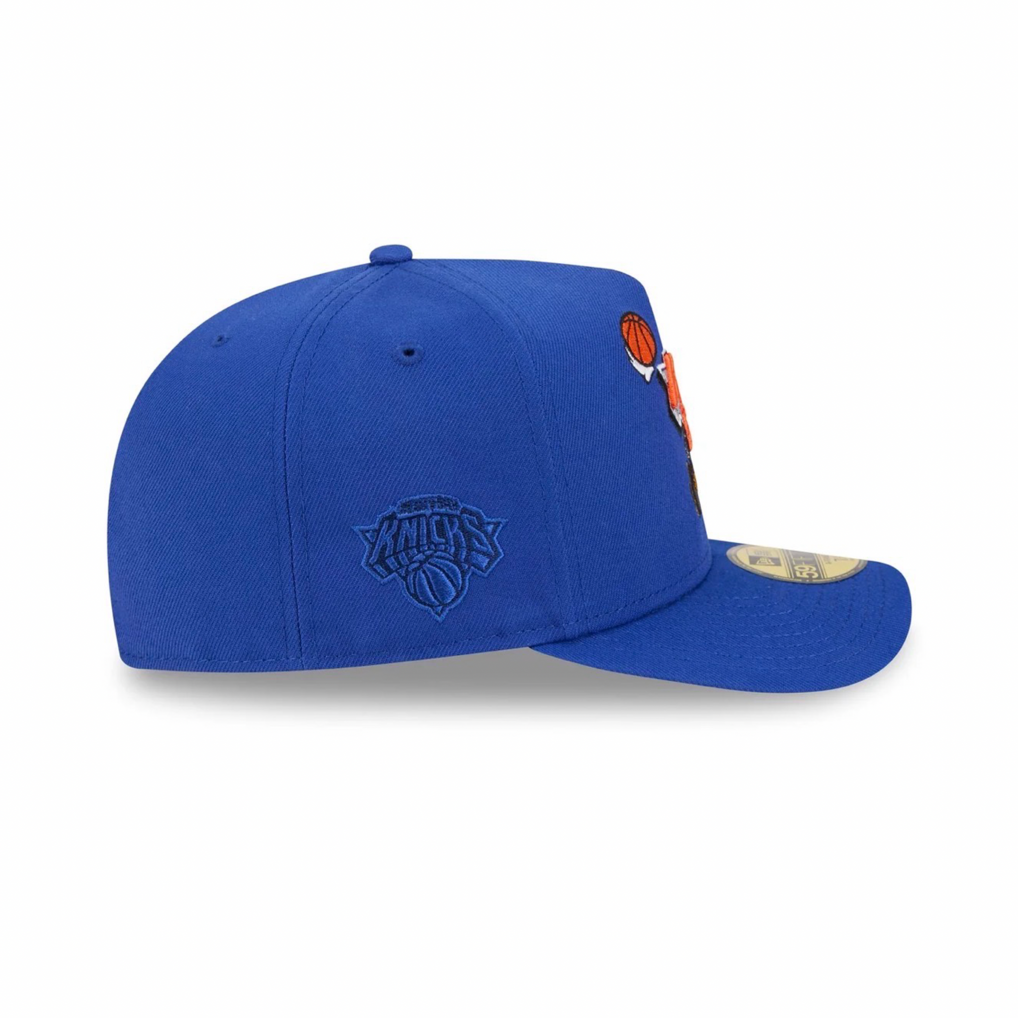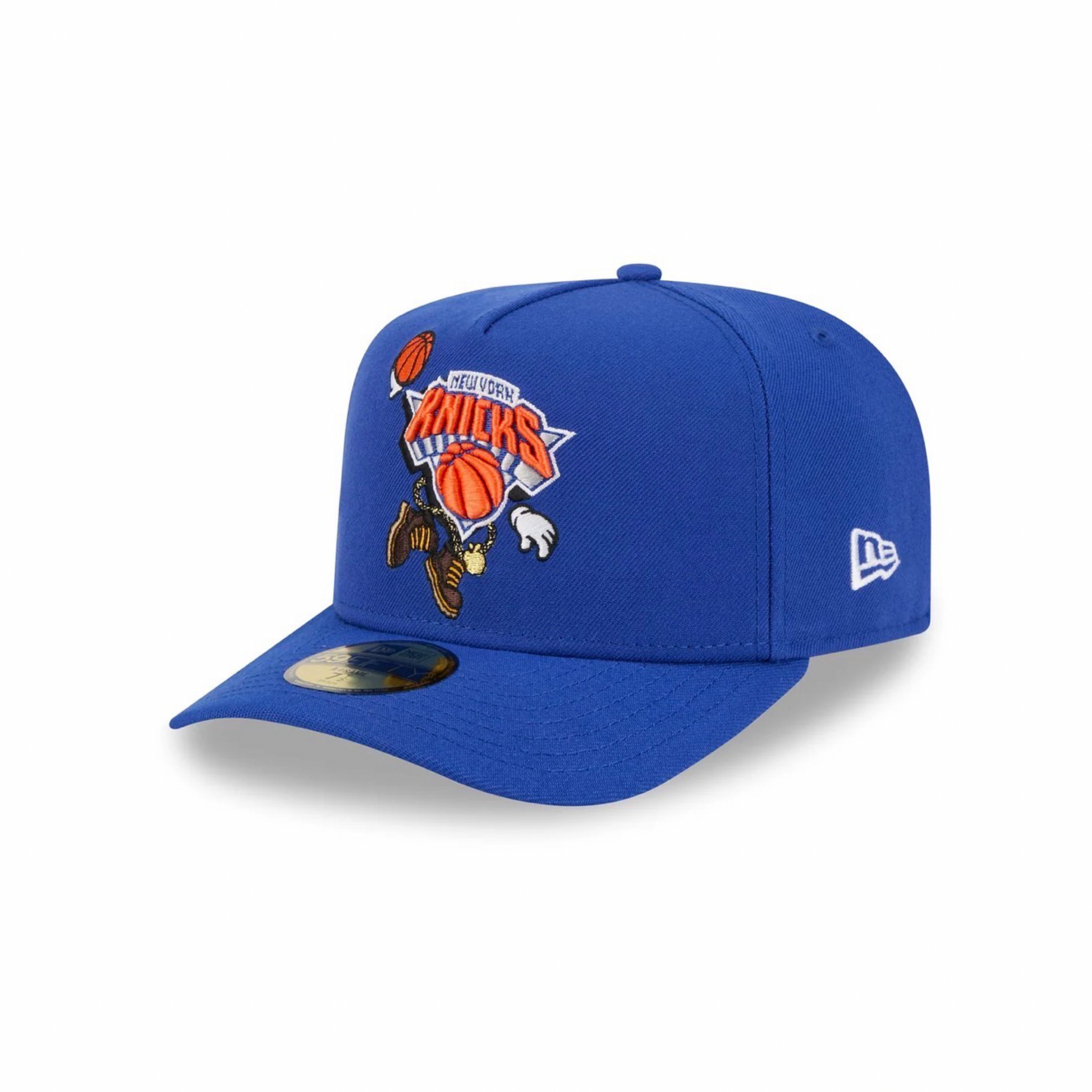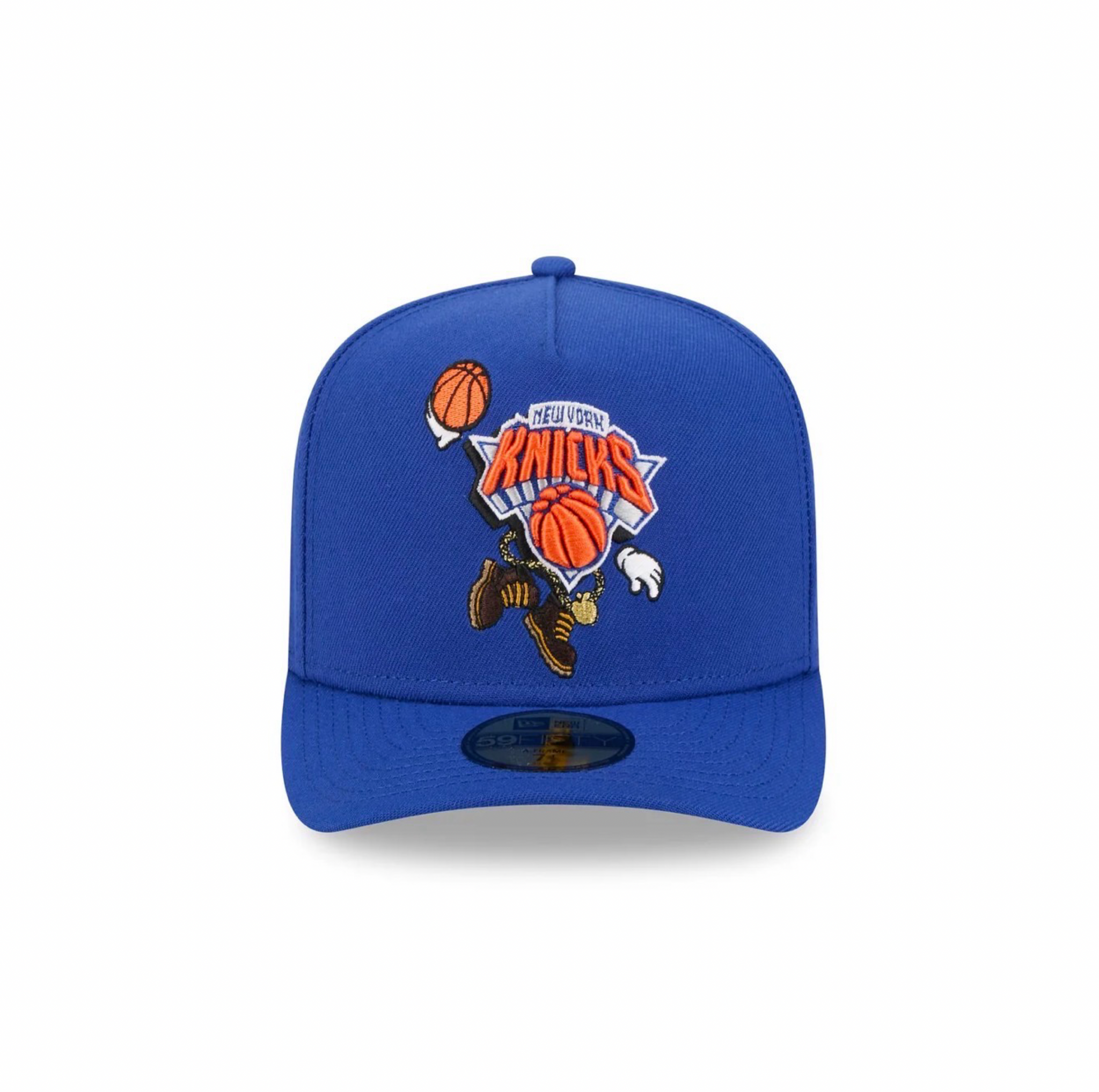 Description The New York Knicks Cartoon 59FIFTY A-Frame Fitted Cap features an embroidered Knicks cartoon themed logo at the front with a matching NBA Logoman at the rear, a monochromatic team logo at the right-wear side, and a gray undervisor.